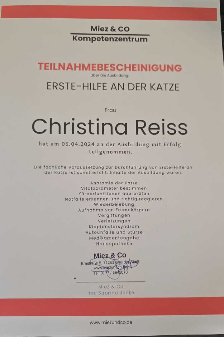 Dieses Wissen fließt täglich ganz praktisch in meine Arbeit ein – verantwortungsvoll, individuell und immer zum Wohl Ihrer Katze.